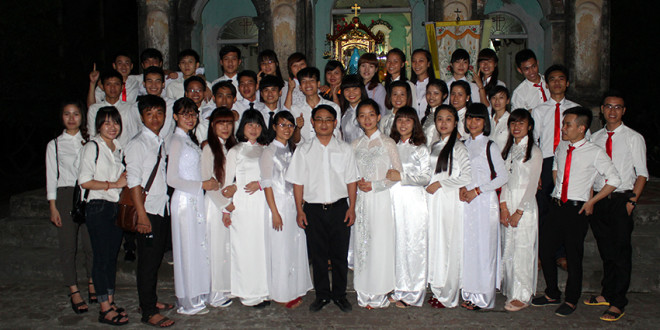 Sau thánh lễ, hai đội hoa chụp hình kỉ niệm với cha Giuse Nguyễn Viết Chinh, những nụ cười bình an, vui tươi, chứa chan sự hiệp thông trong cùng một cây nho đang nở trên mỗi bạn sinh viên sau khi được lãnh nhận của nuôi linh hồn là mình thánh Chúa Kitô.
